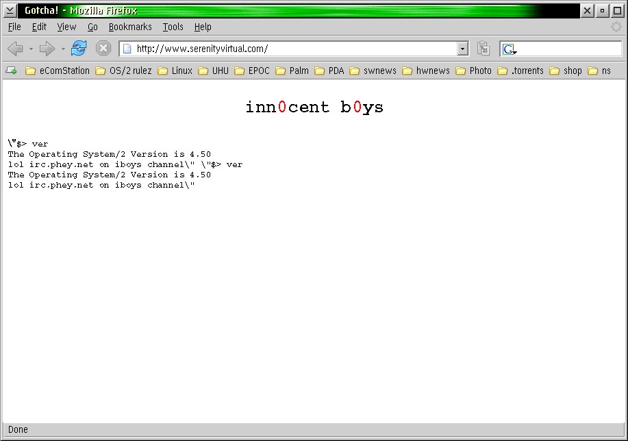 | Just tried again and this is what I get from the URL. \"$> ver The Operating System/2 Version is 4.50 lol irc.phey.net on iboys channel\" \"$> ver The Operating System/2 Version is 4.50 lol irc.phey.net on iboys channel\" |