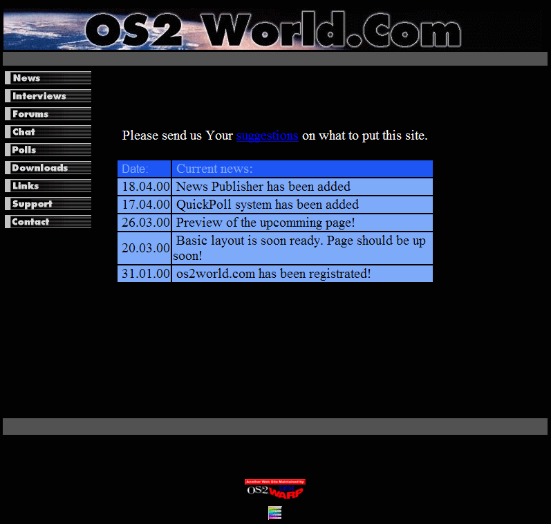 last updated at 17 Apr, 2004 00:04 (1 times) Well, was cleaning up among backup files and found the first release of the OS2 World layout. Well, we are currently running with the 3rd layout of the site.