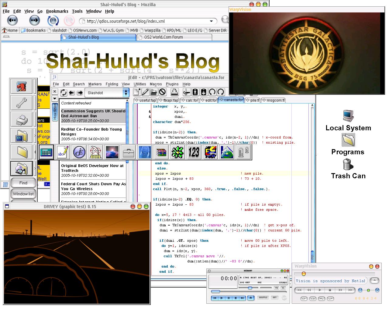 last updated at 19 Oct, 2005 11:41 (2 times) Hi, I just spent (probaply wasted) a lot of time playing around with my system. I'm using eCS 1.1, CandyBarz (with the Aqua skin, modified by me) and my own color scheme. I use the unofficial AquaMoz theme for Mozilla. jEdit is a bit modified, too. E.g. I use the BufferTabs, LineGuides (handy for FORTRAN) and Headlines (RSS reader) plugins as well as the "Look and Feel" plugin with an Aqua-themepack. WarpVision's Aqua Skin is from the original homepage where you can find it in some FTP archives (where you can find the other skins, but it isn't linked at the homepage). The other program isn't Winamp but PM123 with a transformed and just slightly modified Winamp Aqua-skin that has no round corners . I also don't use the eCenter but the good ol' toolbar with BubblePad and the lSwitcher as seperate program that just pops up if I move my pointer to the screen bottom. The program in the lower left corner is DRIVEY (http://drivey.com/) (it was just mentioned at /.) running fine with Odin.  There's also WarpGLOBE in the background and eClock but you can't see much of it. If you are interested, I could post another screenshot showing a native OS/2 dialog (with buttons and checkboxes and so on) and the lSwitcher (just modified the colors).What do you think? mrg Robin |