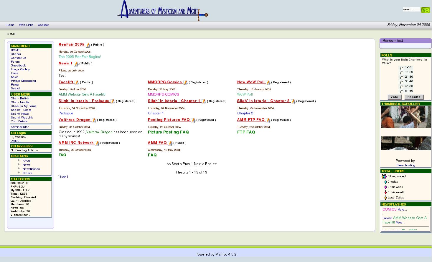 last updated at 05 Nov, 2005 01:45 (2 times) I've maintained a website for years under OS/2. It's based on the CMS Mambo, (now called Joomla at http://www.joomla.org/), and I use the SMF forum system which is second to none. http://www.simplemachines.org/I've attached a couple of images to give you an idea. One thing I'd like to point add. I don't like fixed with websites. I keep my screen resolution at 1600x1200 and most of my browser realestate is wasted on background images/colours left to right. (Themes can control that in some.) So regardless what you decide on, my vote goes for a flexible width setup. BTW, each of those red news blurbs in the main section are clickable links that take you to the full story. If you have questions post them here or e-mail me. Arg! This forum will only let me upload one attachment. So I'll include only the main page.