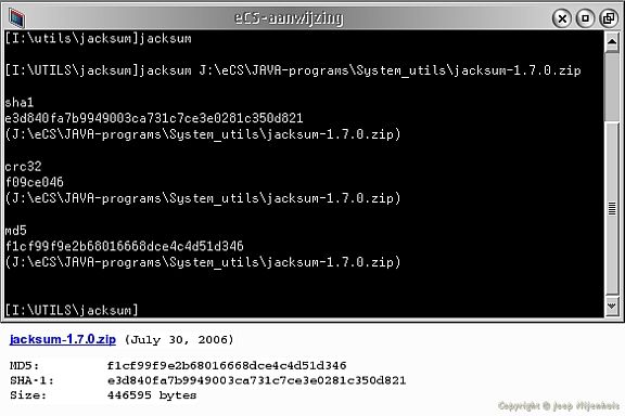 I have added a new utility to my Java homepage. Its called Jacksum and it can check if your download is the same as on the server and lots of more situations were Jacksum can be a handy tool. Read more on my page in English http://joopn.home.xs4all.nl/os2ecs/ecs6e162.htm or in Dutch http://joopn.home.xs4all.nl/os2ecs/ecs6n162.htm. Mind it does not have a GUI,its a so called CLI program,so here a picture;