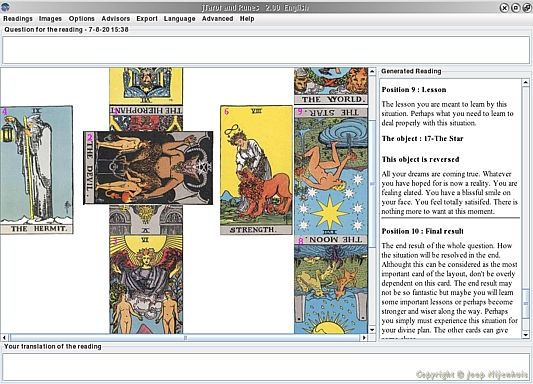 I have added a new game to my Java corner. If you can call it a game is up to you. The program is called jTarot and it uses special cards.  jTarot is a tarot personal advisor. jTarot will do a "reading" for you when you need advice. You can read more on my page in English http://joopn.home.xs4all.nl/os2ecs/ecs6e173.htm or in Dutch http://joopn.home.xs4all.nl/os2ecs/ecs6n173.htm.