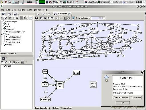Here a compilation of two pictures, above the steps the program makes to solve the problem of the ferryman. At the bottom the graphic representation of the wolf, the goat and the cabbage. The ferryman can only transport one item each time. The wolf will eat the goat  and the goat will eat the cabbage if the ferryman is not there to keep both separated. All three need to be transported to the other side. This program gives you the tools for solving the problem. But once you understand it you can put in much more complex problems and see what happens. In the end you can make the right choices.