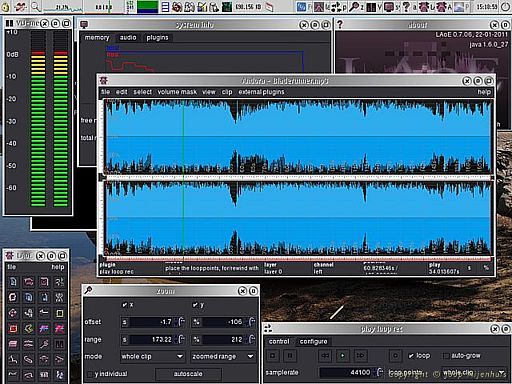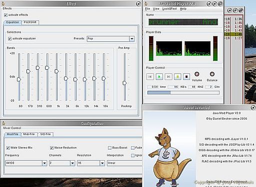 I have added a new multimedia program to my site today. Its a player with lots of features (for a player) and its called JavaMod. On the picture below you see different windows of the program, normally only the window with the play buttons and the meters is visible.